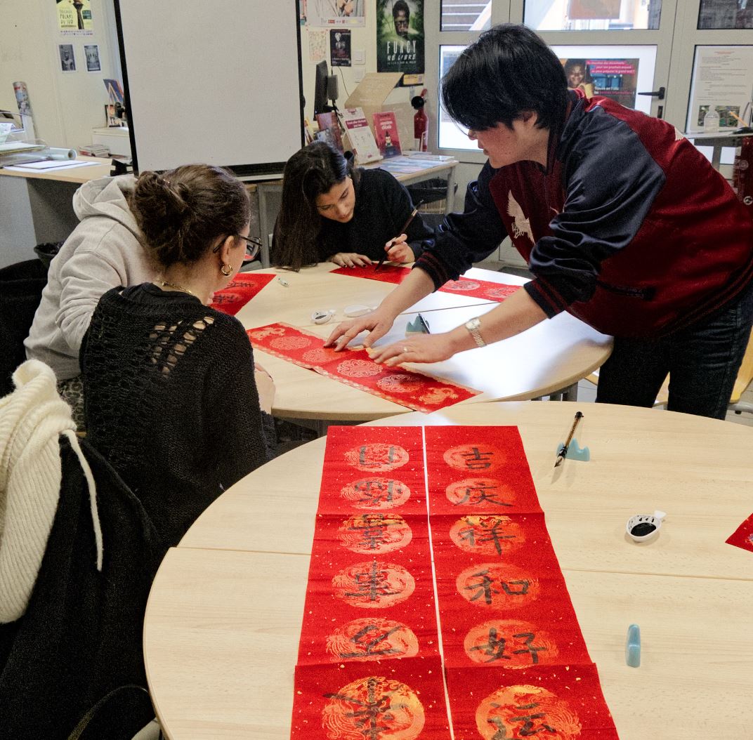 Sous l’impulsion de Jia, notre professeure de chinois, et de ses élèves, notre lycée s’est paré de lanternes et de Chunlian, ces couplets de printemps écrits sur du papier rouge. Le CDI a mis en place une exposition et un atelier d’initiation à la calligraphie. Enfin, Jia a emmené ses élèves à la découverte de la fameuse gastronomie chinoise au restaurant « Le Vieux Pékin ». Une expérience délicieuse ! Marc, un vieil ami français de Jia, nous a rejoints pour partager son expérience de professeur au sein d’une université pékinoise depuis une quinzaine d’années.